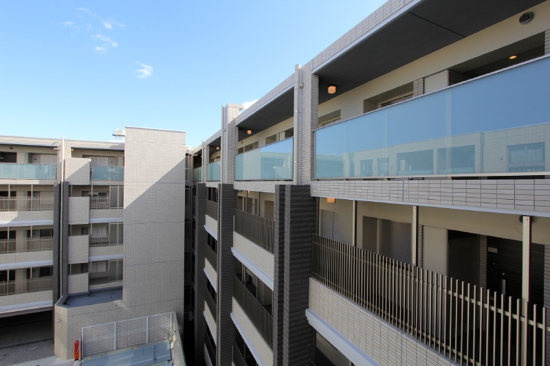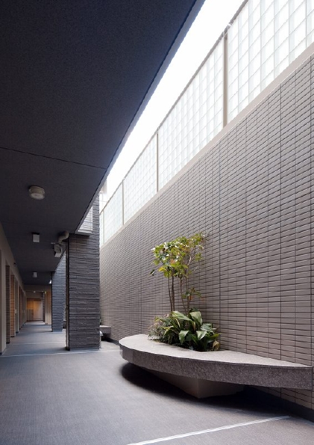 5階を支えるように並ぶ列柱が中庭を囲み、廊下側の列柱は、縦樋を隠せるよう、ダブルの付け柱となっています。
