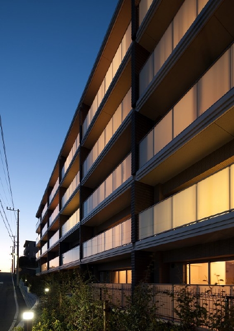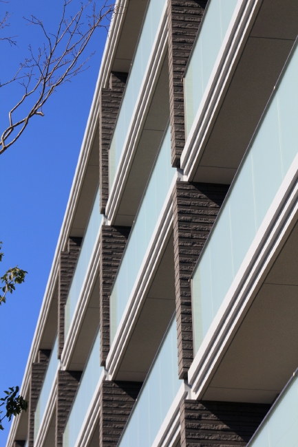 水平に伸びるバルコニーの乳白ガラス手摺の平滑さと、これをひとつずつ力強く支えるような垂直の壁の質感のコントラストによって一層一層「積み重ね」ています。