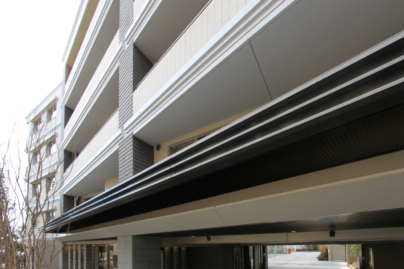 エントランスは坂をほぼ上りきった位置にありますが、車寄せと一体になった大きな庇を設け、水平線を強調しています。